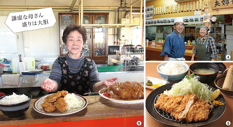 ③店主・幡谷豊和さんが手にしているのは、寿司屋仕込みのビッグな卵焼き!昼は食堂、夜は居酒屋。町民が集まる憩いの場です。継ぎ足しタレが絶品の焼鳥、地元野菜をたっぷり使った鍋物などが好評で、ご近所には手作り料理を詰めたお弁当まで作って配達してくれる!「30年やってるから、三世代のお客さんがくるのがうれしいね」。創業時から価格もほとんど変わっていません。