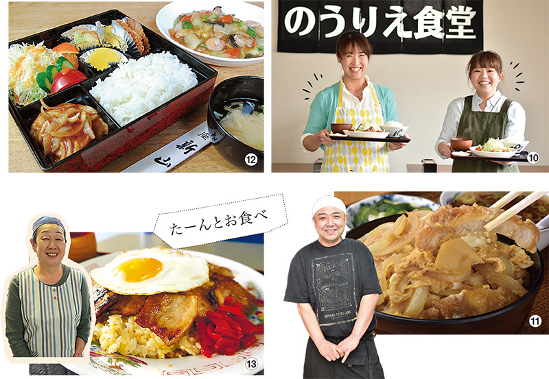 ⑨創業48年、2代目の高橋剛志さんを中心に、奥さんと初代のお父さんの3人で切り盛りする食堂。剛志さんが惚れこんだ渓谷・味豚の炙り豚丼をはじめ、定食、カレー、ラーメン、そば、うどんなどメニューはたくさん。寿司職人の初代が握る寿司やバラちらしも人気です。物腰柔らか、物静かな剛志さんですが、実は大の音楽好き(それもかなりのハード系へヴィメタル!)。選び抜いた食材のセレクトにも、内に秘めた熱い思いを感じます。