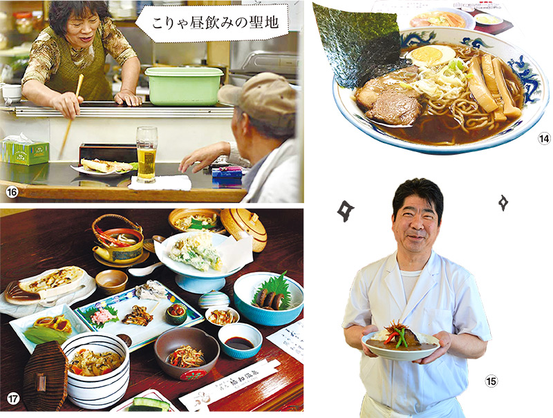 ⑫夜の居酒屋営業が中心だけど、地元っ子は昼も大好き。しょうが焼きやエビフライ、あんかけ焼きそばなどの定食が人気です。「冷めた料理は出さない。できるだけ早く提供する」という自分ルールを厳守するため、混みはじめると扉に掲げた「営業中」のフダをひっくり返すことさえある(笑)、職人気質の店主・桐生義信さんと元気な奥さん・千代美さんのボケ&ツッコミ合戦が見られたら、もう常連の証です。