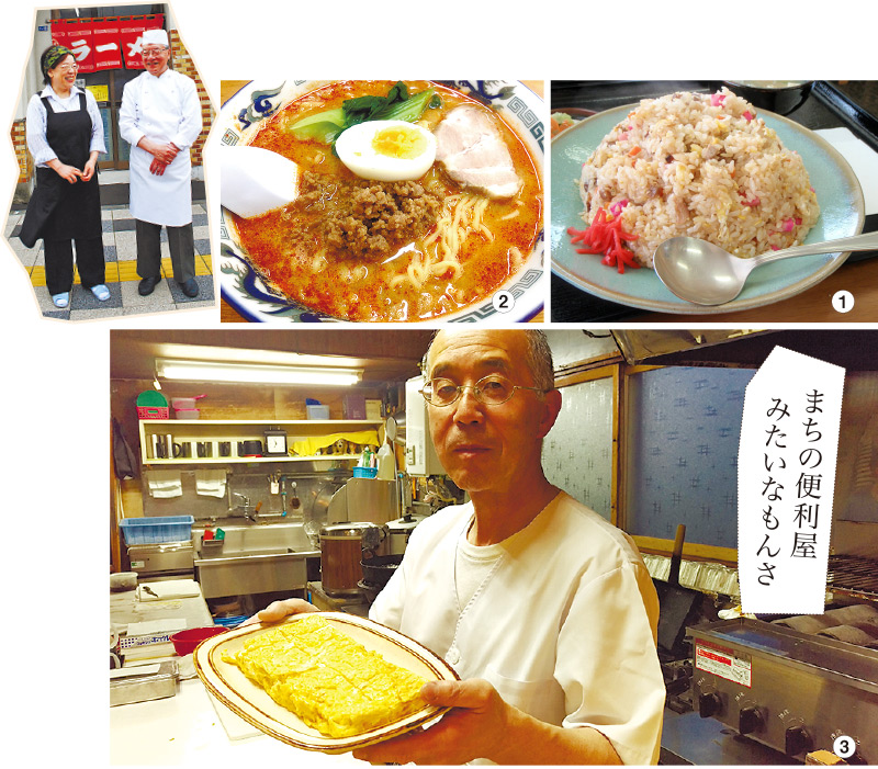 ①毎朝3時に店に来て、仕込みや準備をはじめる店主の久末さん夫妻。現在の人気ランキングは、1位しょうが焼き定食、2位チャーハン定食、3位肉野菜定食。とくにチャーハンは700gの大ボリュームで、まるで山。惜しくもランク外ながら根強い人気の「おかめ定食」では、開拓時代からの道産子料理「いもかす団子」を汁物で提供しています。