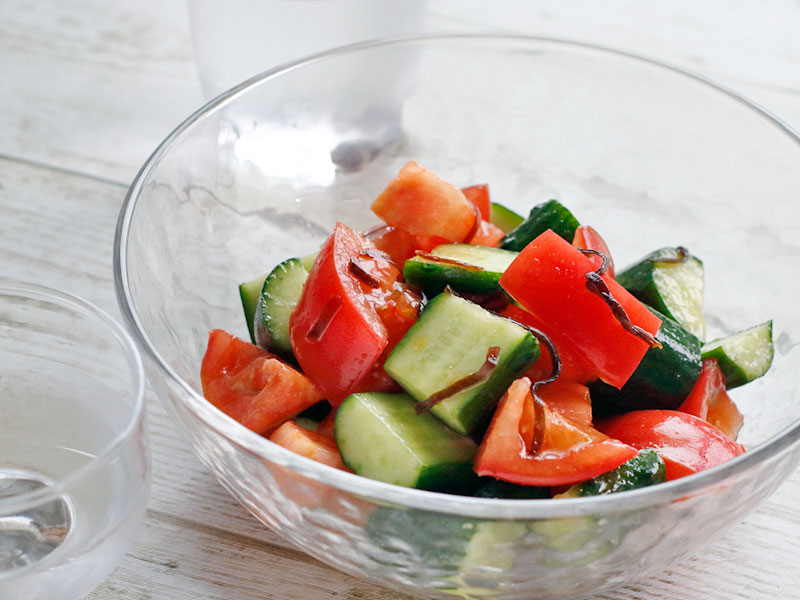 食べ良く切ったキュウリに軽~く塩をまぶす。水気が少し出始めたら角切りにしたトマトと塩昆布少々、ごま油少々をさっくり混ぜる。昆布がしっとりしたら出来上がり。