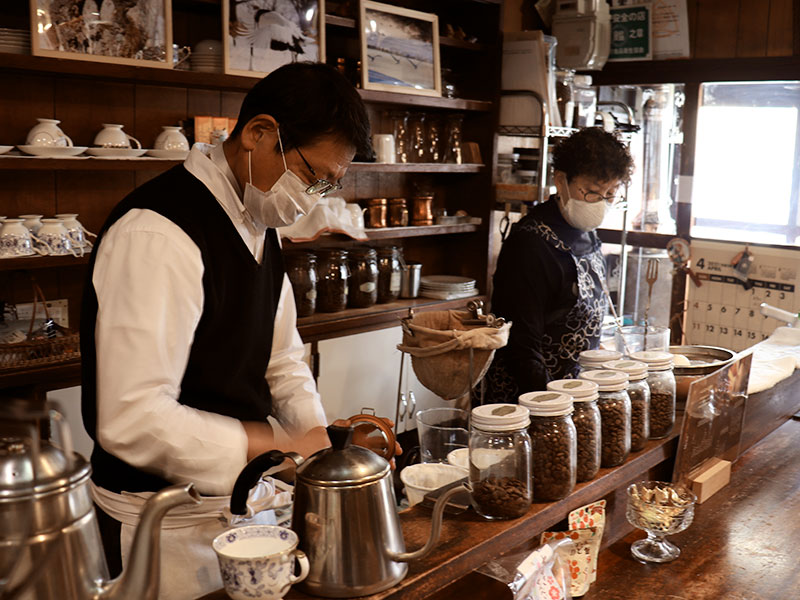 5月で44周年を迎える同店は、東京にある神田珈琲園ののれん分け。マスターは19歳の頃から神田のお店で修業し、結婚を機に奥様の地元旭川で開業。こだわりは自家〝直火”焙煎。当時は市内に800店舗ほど喫茶店があるなか、自家焙煎のお店は数えるほどしかなく、珍しかったそうだ。
