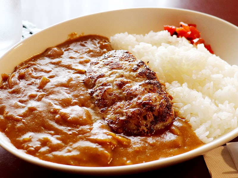 カレーは創業当時からの人気メニューで、先代から引き継いだレシピのまま今でも提供されている。じっくりと煮込んだ玉ねぎの甘みが溶けだす深い味わいは、言葉にするのも野暮ってもんだ。楕円形の白いカレー皿に真っ赤な福神漬け、肉々しくジューシーなハンバーグが、濃いめのルーによく似合う。夢中でかき込み、心地よい辛さと余韻に浸りながら水を一気に飲み干した。