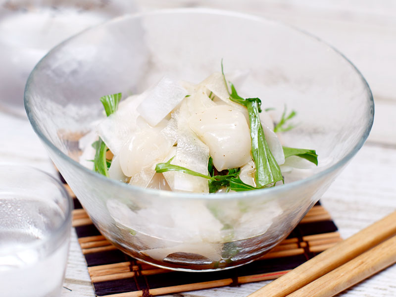 細切り大根に貝柱。料理本ではホタテ缶を使うとされる1品だけど、北海道だもの、夏の生ホタテで楽しみたい。アクセントに水菜かかいわれを加えて和えたらドレッシングをかけて召し上がれ。