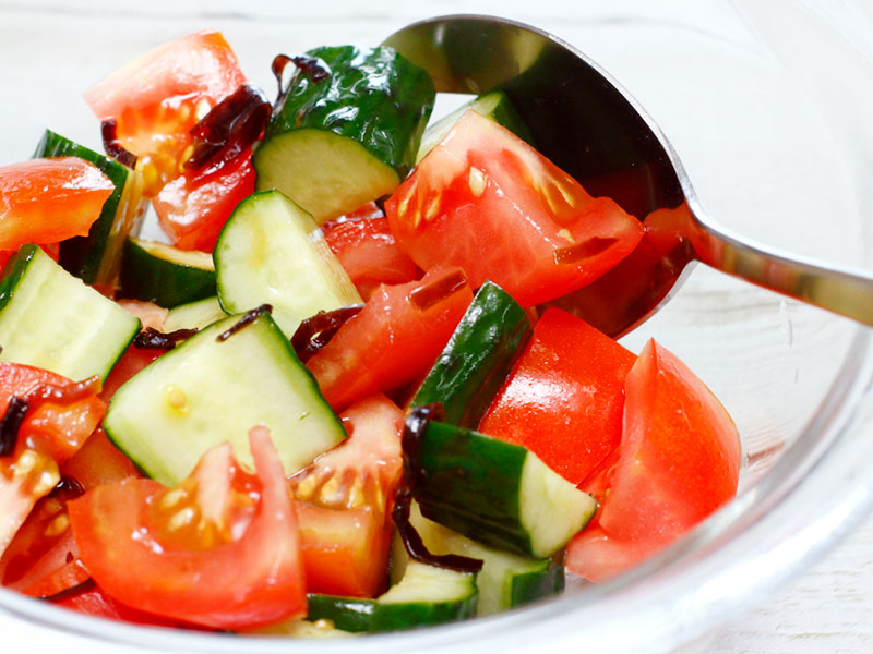 トマトときゅうりと食べ良く切って、軽く塩をふって馴染ませる。そこに塩昆布、香り付けにごま油少々を加えて混ぜる。