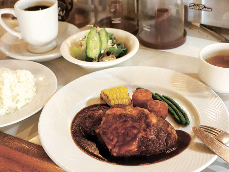 昭和を象徴する電話ボックスの名残りとWi-Fi環境のコントラスト、ママが注文を取りに行くたびに反応する自動ドアが、なんともいえず愛おしい。ほどなくしてハンバーグが到着した。早速一口頬張ると、たっぷりのチーズと肉汁、特製のデミソースが混ざり合い、気付けばもう夢中。ナイフとフォークを止める隙もないまま、昭和59年の開店当初から変わらないメニューの奥深さと凄みを堪能した。