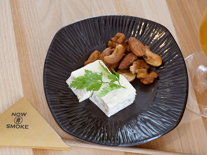 クリームチーズと豆乳、生クリームを合わせたペーストに、練り込まれているのは鶏そぼろ。燻製専門のお店らしく、燻したオリーブオイルをかけています。ペーストの甘味を際立たせるそぼろの塩気、鼻に抜けるスモークの香りはハイボールやビールと相性抜群です。お通しは夜のみ提供で、一人前500円。