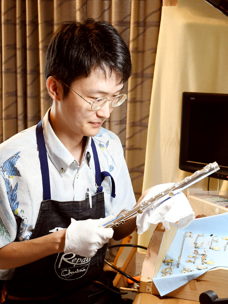 現在旭川近郊に修理が可能な楽器店は多くなく、札幌まで持ち込む人もいるそう。生出さんはできるだけ安価に、どんな故障にも対応できるよう、リサイクルショップやオークションサイトで壊れた楽器を入手し、修理の経験を重ねています。中でも得意な楽器はフルート。はじめは部品が細かく調整が大変なため苦手意識がありましたが、何度も練習するうちに、気が付くと得意になっていました。その腕前が評判を呼び、現在は依頼の8割をフルートが占めています。