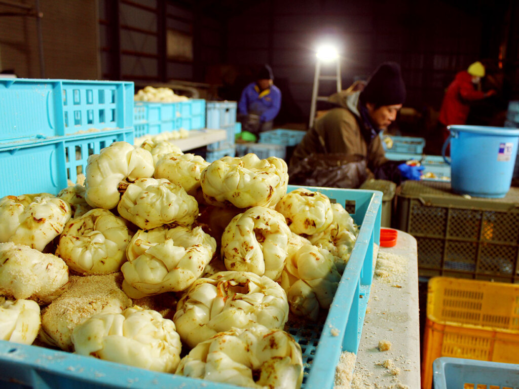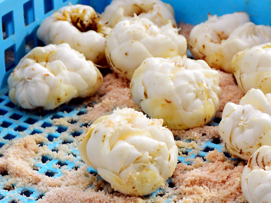 ゆり根は植え付けから収穫まで、実に長い年月を必要とする作物です。1枚のりん片から種となる子球ができるまでに3年、その後さらに3年は毎年畑を変えながら、大人の拳サイズまで育てます。少し傷がつくだけで変色するほどデリケートなため、箱詰めまですべて手作業。湿気にも弱いため、専用のおがくずをたっぷり満たして出荷します。