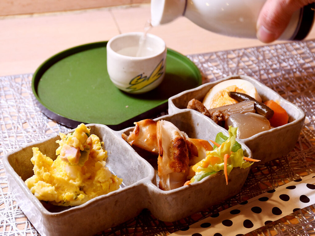 お酒が2杯と、日替わりの惣菜が3品。取材日は、ポテトサラダに餃子、煮物と和洋中を押さえた盤石の布陣。かぼちゃを加えたポテサラは、素材の甘みとハムの塩気がいい塩梅。ひと口サイズの餃子は、ビールが進むのは言うまでもありません。定番料理の煮物は家庭的なほっとする味わいで、買い物ついでの寄り道のつもりが、つい杯を重ねる常連も多いそう。「なるべく作り置きはしないの。出来立てがおいしいじゃない」とママ。