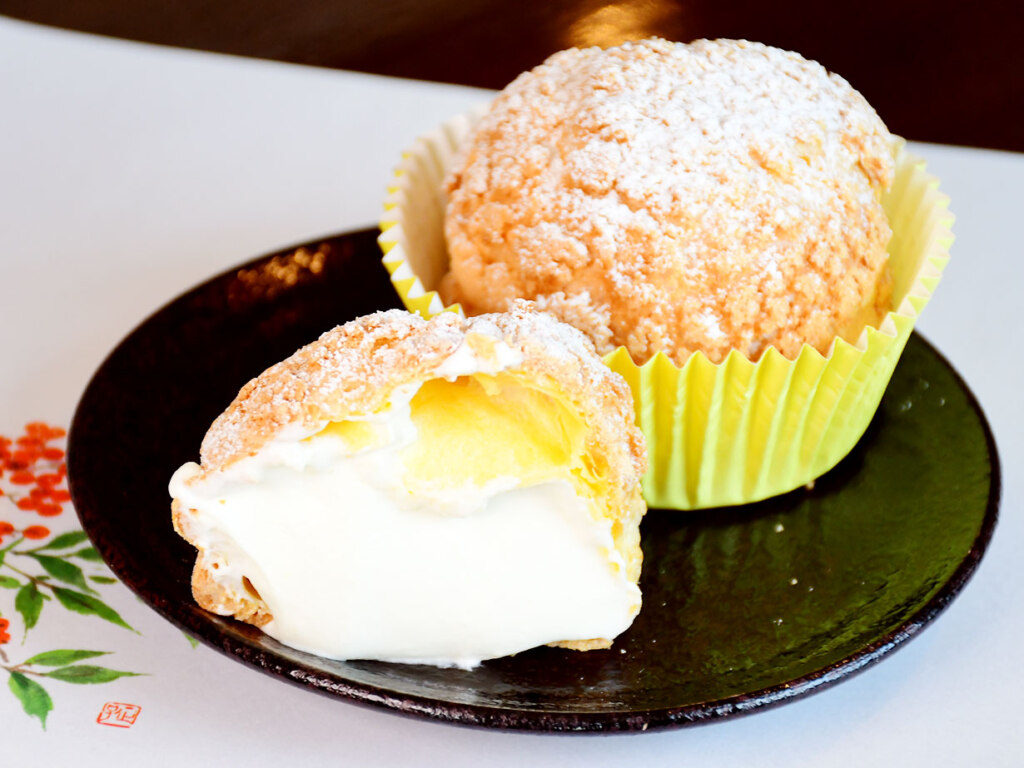 握りこぶしほどの大きさで、持てばずっしりとした重さに驚かされます。香ばしい生地を割ると、生クリームとカスタードを合わせたミルキーなクリームがとろり。時期によって味わいが異なる原材料の風味を生かすため、その時々でカスタードと生クリームの配合を調整。卵も生地とクリームで使い分けるなど、丁寧な仕事ぶりが伺える一品です。