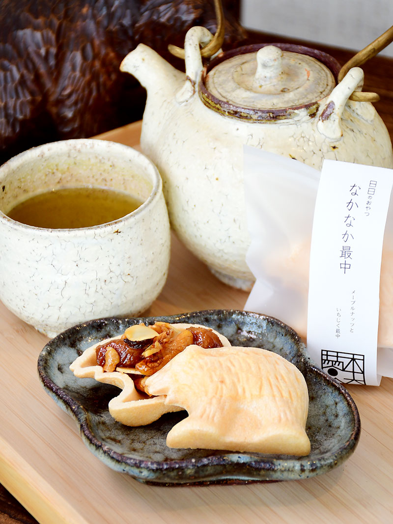 こちらは人気の定番「メープルナッツとイチジク」。道産もち米を焼き上げた愛らしいクマ型の皮に、キャラメリゼしたメープルシュガーで絡めたイチジクやレーズン、くるみなどの具材がたっぷり。素材の食感や風味を、もなかの優しい甘さが包みます。