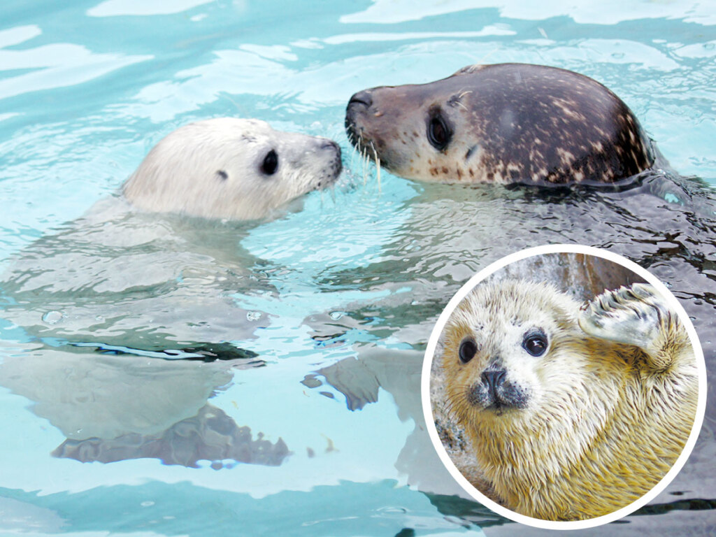 ゴマフアザラシの麦が3月15日に出産しました。麦が赤ちゃんに付きっきりだったのは意外にも生まれた初日ぐらいで、2日目には赤ちゃんから離れ、プールで泳ぐ姿も見られました。それもそのはず、アザラシの成長スピードは驚くほど早く、2週間ほどで授乳を卒業して魚を食べ始めると、体重は生まれてすぐの推定9キロからおよそ3倍に!同時にふわふわの白い毛も抜け、グレーのごま模様になります。「麦は初産で心配もありましたが、水面から顔をのぞかせてわが子を気にしたり、泳ぎ始めると付き添ったりと、戸惑いながらもしっかりお母さんをしています」と飼育担当の篠原さん。