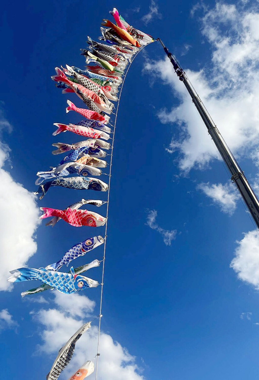 地域に元気を届けたいという思いで始まり、今年で4年目。大型クレーン車のアームに大小55匹の鯉のぼりを掲げ、大空を泳ぐ迫力満点の光景を作り出します。掲揚時間は各日午前9時から午後5時(雨天中止)。