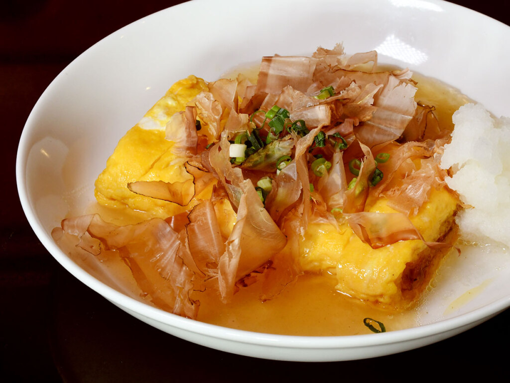 実は玉子を包むあんには、和風だしのほか、店の命ともいえる濃厚な鶏のだしがたっぷりと加えられているのです。玉子と鶏だし。親子が器の中で再会したことで、ただのだし巻きにはない圧倒的な一体感と、奥深いコクが生まれました。焦げ一つない美しい焼き色ととろける食感に、オーナーがこの料理にかける、並々ならぬ思いを感じます。この先もきっと、この店の看板であり続ける親子たち。一人前580円。