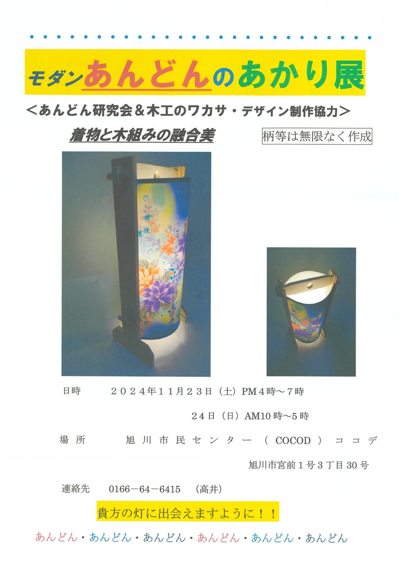 お探しのイベントは終了しましたモダンあんどんのあかり展2024年11月23日(土) 〜 11月24日(日)23日(土)16~19時、24日(日)10~17時旭川市市民活動交流センターCoCoDe(旭川市宮前1条3丁目3-30)芸術文化