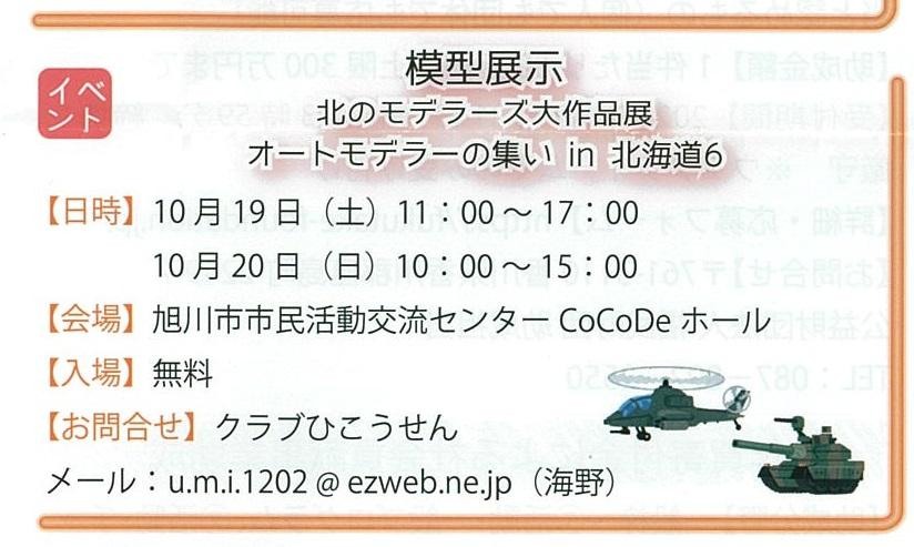 お探しのイベントは終了しました模型展示 北のモデラーズ大作品展 オートモデラーの集いin北海道62024年10月19日(土) 〜 10月20日(日)19日11~17時、20日10~15時旭川市市民活動交流センターCoCoDeホール(旭川市宮前1条3丁目3-30)趣味