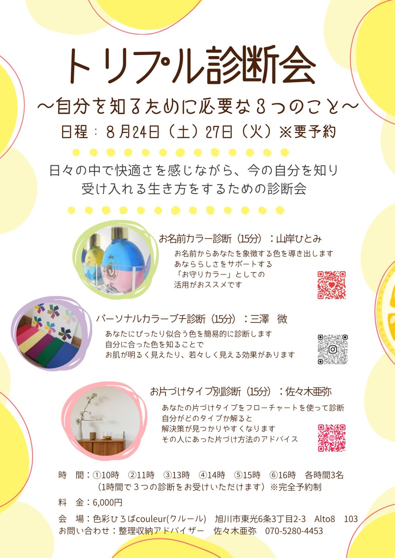 日々の生活をもっと快適に、自分の人生をもっと楽しくするための診断会です。 『すべては自分を知ることから始まる』を胸に3人のプロたちが、自分を知るための3つの視点からあなたの特徴探しをお手伝い! 日常の小さなモヤっと解決のために、自分探索をしましょう。 ★お名前カラー診断~お名前からあなたの特徴を表す色を導き出します。あなたの気持ちを上げてくれるお守りカラーです。 ★パーソナルカラー診断~あなたに似合う色を導き出します。あなたの表情を輝かせ魅力を高めてくれるカラーです。 ★お片づけタイプ別診断~フローチャートを使ってあなたのお片づけタイプを診断します。タイプ別のお片づけアドバイスが受けられます。 約1時間でそれぞれ15分ずつの診断が受けられます。 【日程】8月24日(土) 【時間】10時、11時、13時、14時、15時。16時(要予約) 【定員】各時間3名 ※ご都合の良いお時間をお選びください。 【料金】6,000円 【申し込み先】整理収納アドバイザー 佐々木亜弥 070-5280-4453