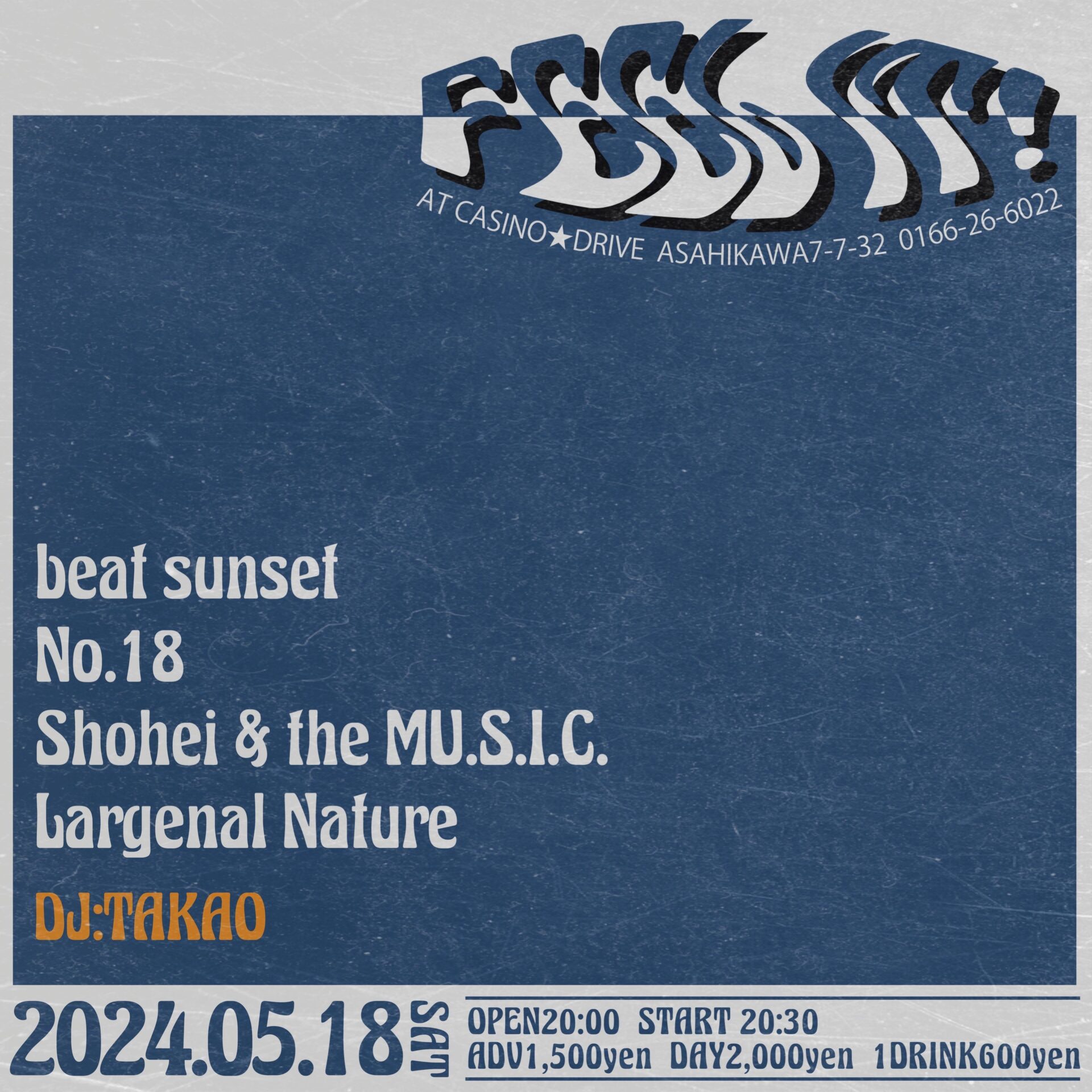 2024年05月18日(土) FEEL IT! OPEN20:00 / START20:30 ADV¥1,500(税込) / DAY¥2,000(税込) / 1DRINK代別 【LIVE ACT】 beat sunset(札幌) No.18(札幌) Shohei & the MU.S.I.C.(札幌) Largenal Nature 【DJ】 TAKAO チケット予約 各バンド取り置きまたはカジノドライブチケットフォーム お問い合わせ カジノドライブ 0166-26-6022(水曜定休)