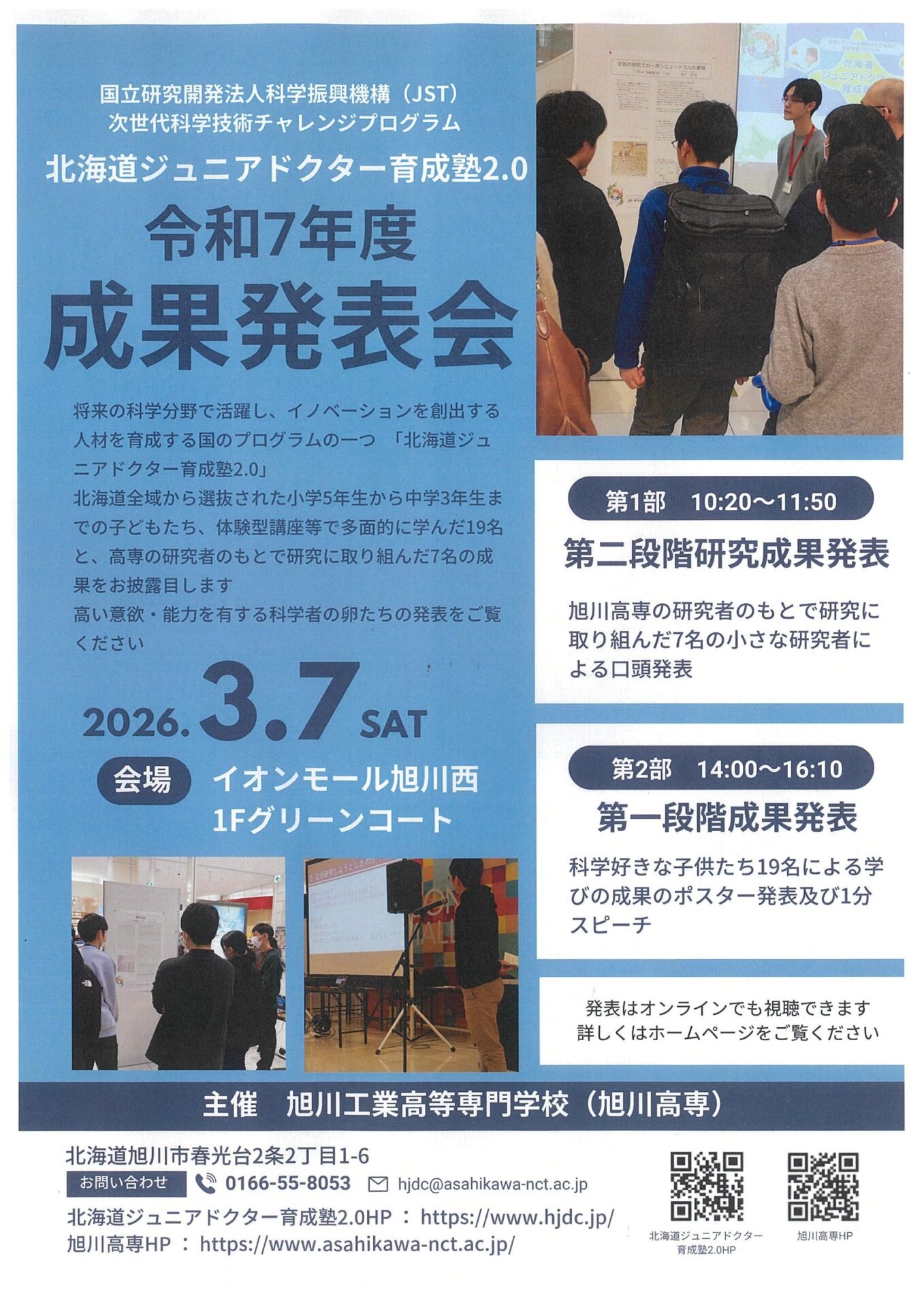 お探しのイベントは終了しました北海道ジュニアドクター育成塾2.0 令和7年度 成果発表会2026年3月7日(土)第1部10:20~11:50、第2部14:00~16:10イオンモール旭川西店 1階 グリーンコート(旭川市緑町23丁目2161-3)趣味