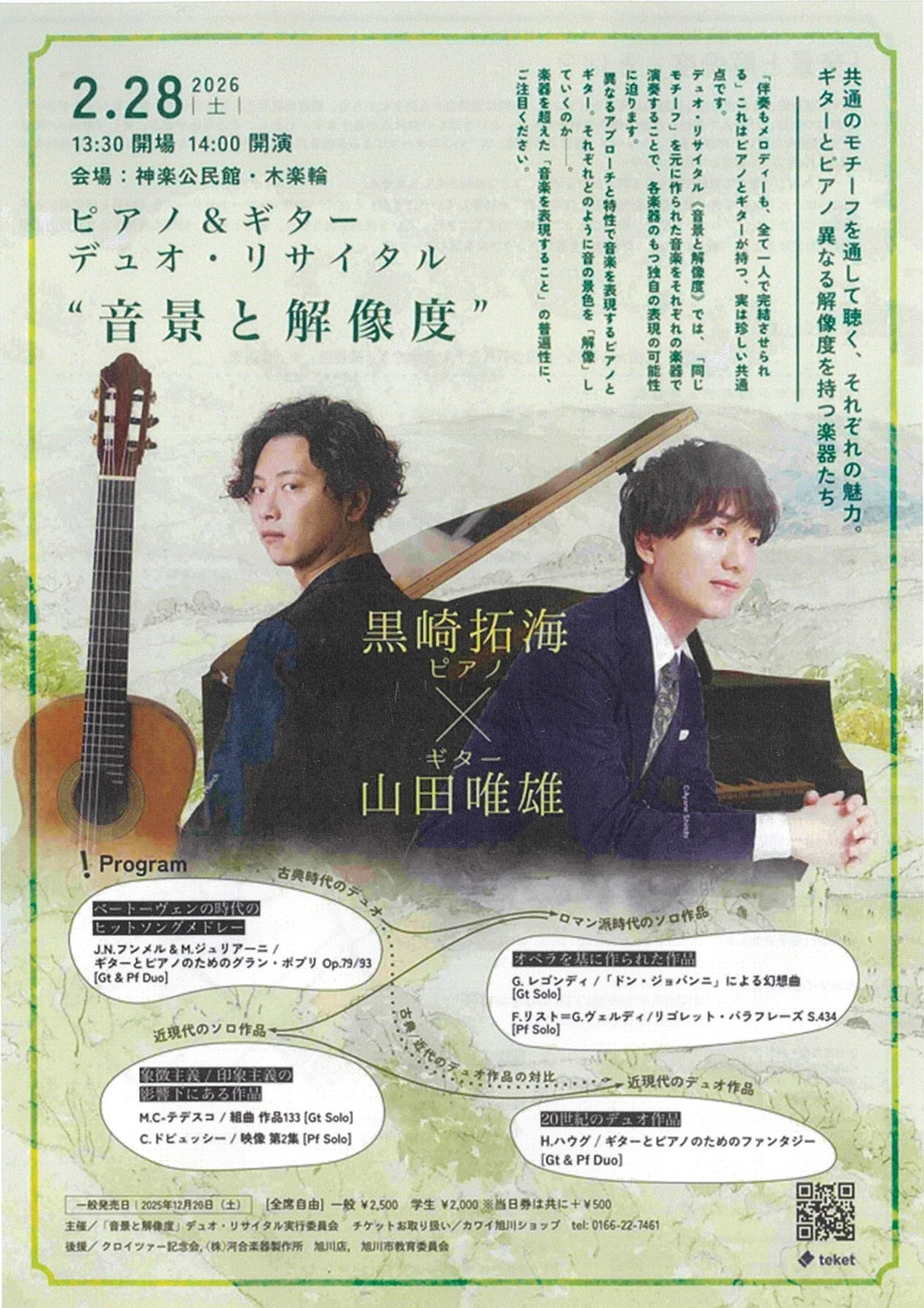 お探しのイベントは終了しました黒崎拓海 山田唯雄 ピアノ&ギター デュオ・リサイタル ”音景と解像度”2026年2月28日(土)開場13:30、開演14:00神楽市民交流センター 木楽輪(旭川市神楽3条6丁目1-12 )音楽
