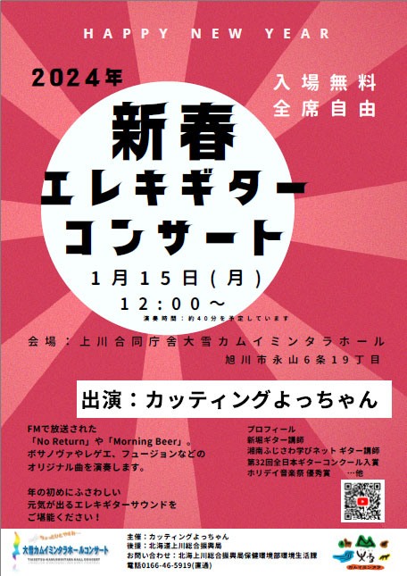 お探しのイベントは終了しました大雪カムイミンタラホールコンサート「新春エレキギターコンサート」2024年1月15日(月)12:00~13:00北海道上川合同庁舎 1F大雪カムイミンタラホール(旭川永山6条19丁目)音楽