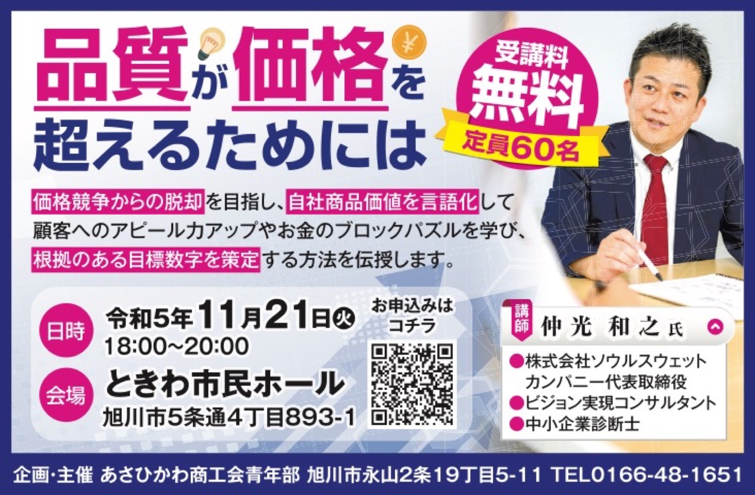 お探しのイベントは終了しました品質が価格を超えるためには2023年11月21日(火)18:00〜20:00旭川市ときわ市民ホール(旭川市5条通4丁目893-1)開催情報開催日程2023年11月21日(火)開催時間18:00〜20:00会場旭川市ときわ市民ホール旭川市5条通4丁目893-1料金受講料無料備考定員60名#セミナー・講演