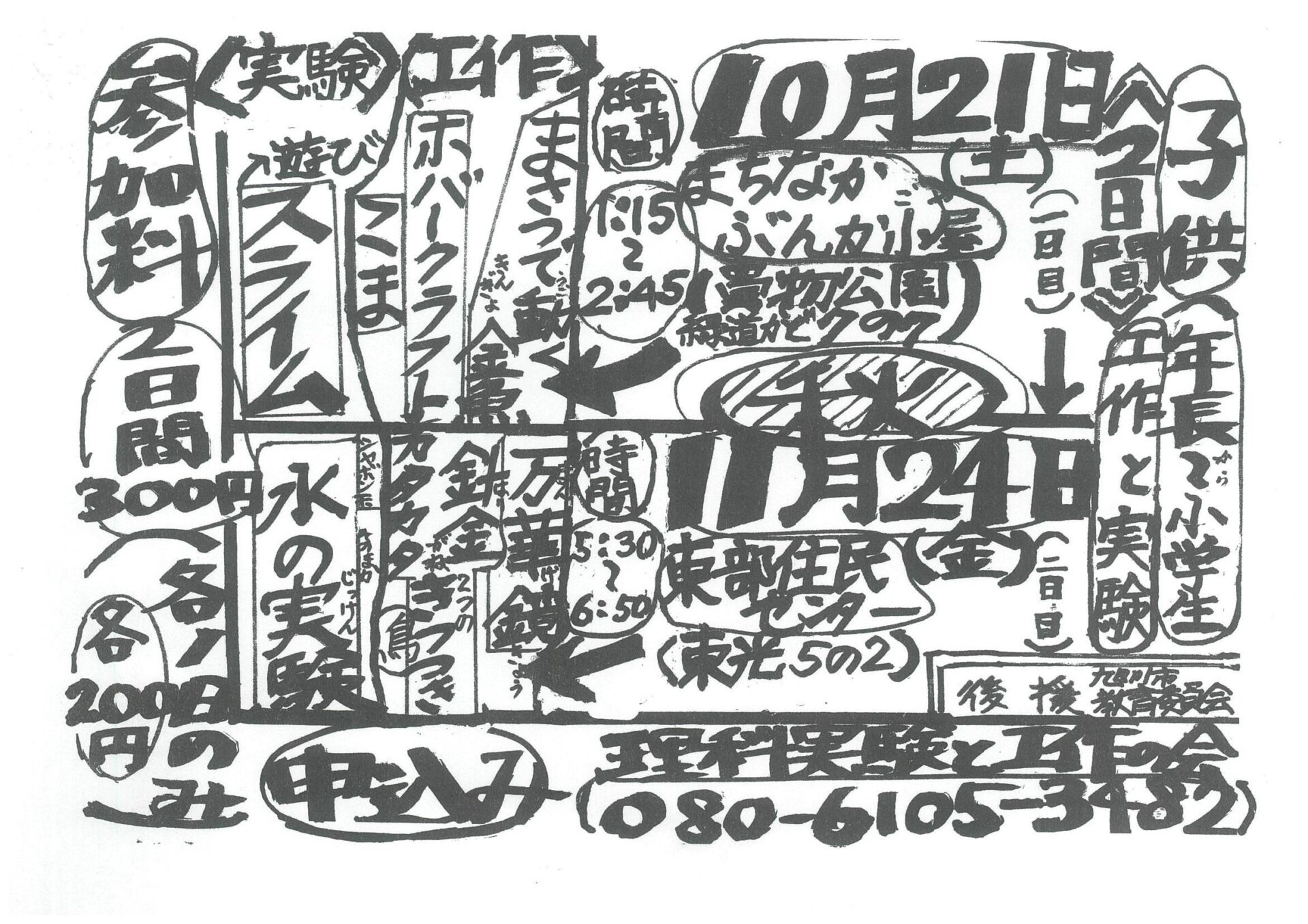 ①10月21日(土) 【工作】まさつで動く金魚、ホバークラフト、こま 【実験】スライム 【場所】まちなかぶんか小屋(7-7) ②11月24日(金) 【工作】万華鏡、針金2つのきつつき 【実験】水の実験 【場所】東部住民センター(東光5-2)
