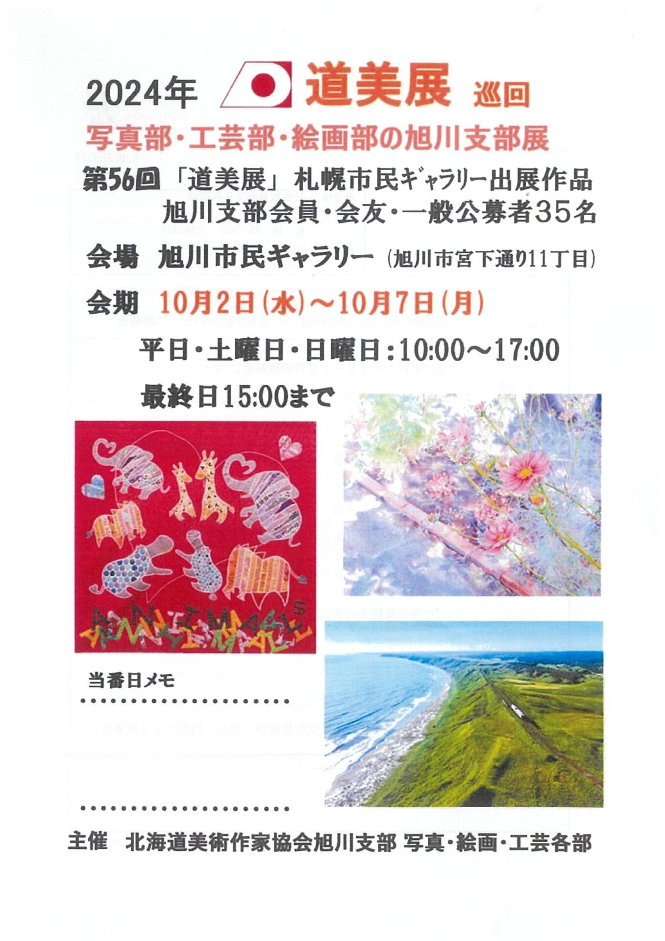 お探しのイベントは終了しました2024年道美展巡回 写真部・工芸部・絵画部の旭川支部展2024年10月2日(水) 〜 10月7日(月)10:00~17:00旭川市民ギャラリー(旭川市宮下通11丁目 上川倉庫 蔵囲夢コレクション館内)芸術文化