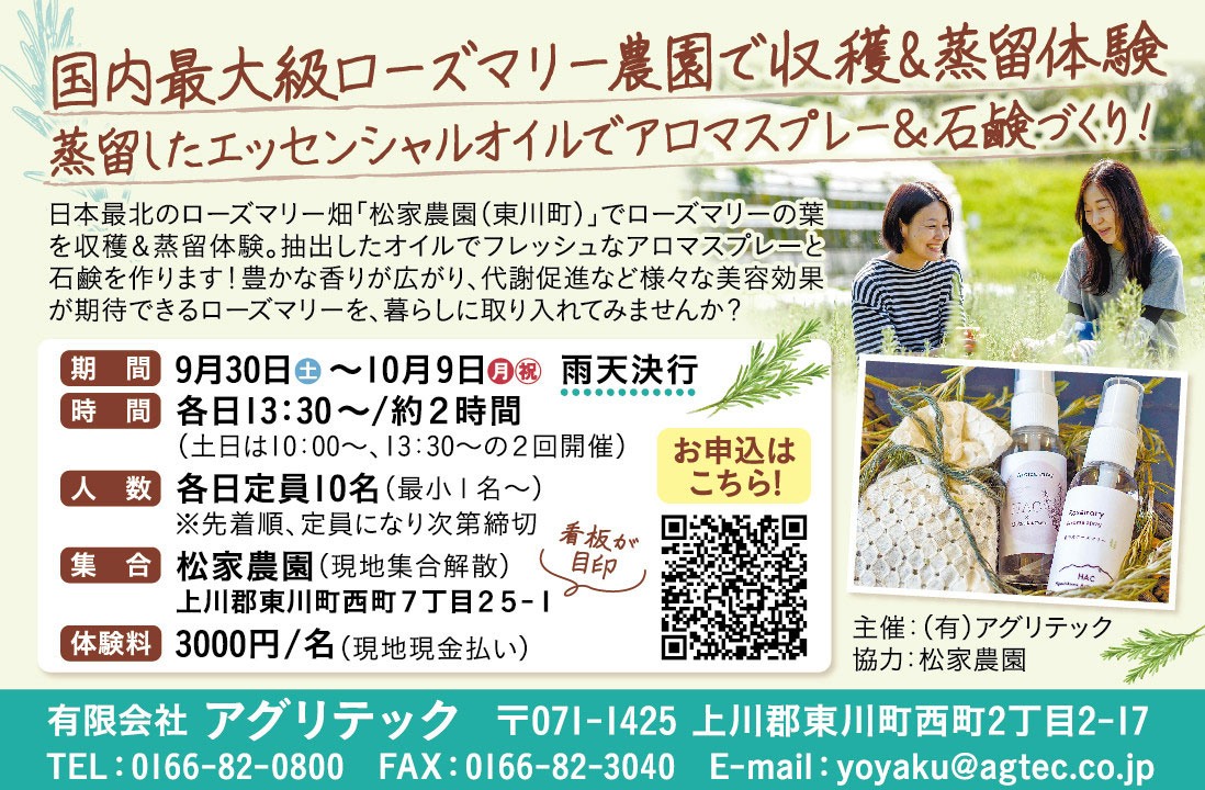 お探しのイベントは終了しました国内最大級ローズマリー農園で収穫&蒸留体験2023年9月30日(土) 〜 10月9日(月)各日13:30〜/約2時間(土日は10:00〜、13:30の2回)松家農園(東川町西町7丁目25-1)