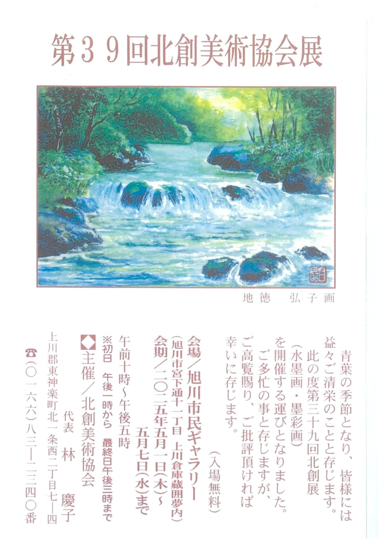 お探しのイベントは終了しました第39回北創美術協会展2025年5月1日(木) 〜 5月7日(水)10:00~17:00(初日13:00より、最終日15:00まで)旭川市民ギャラリー(旭川市宮下通11丁目上川倉庫 蔵囲夢)芸術文化
