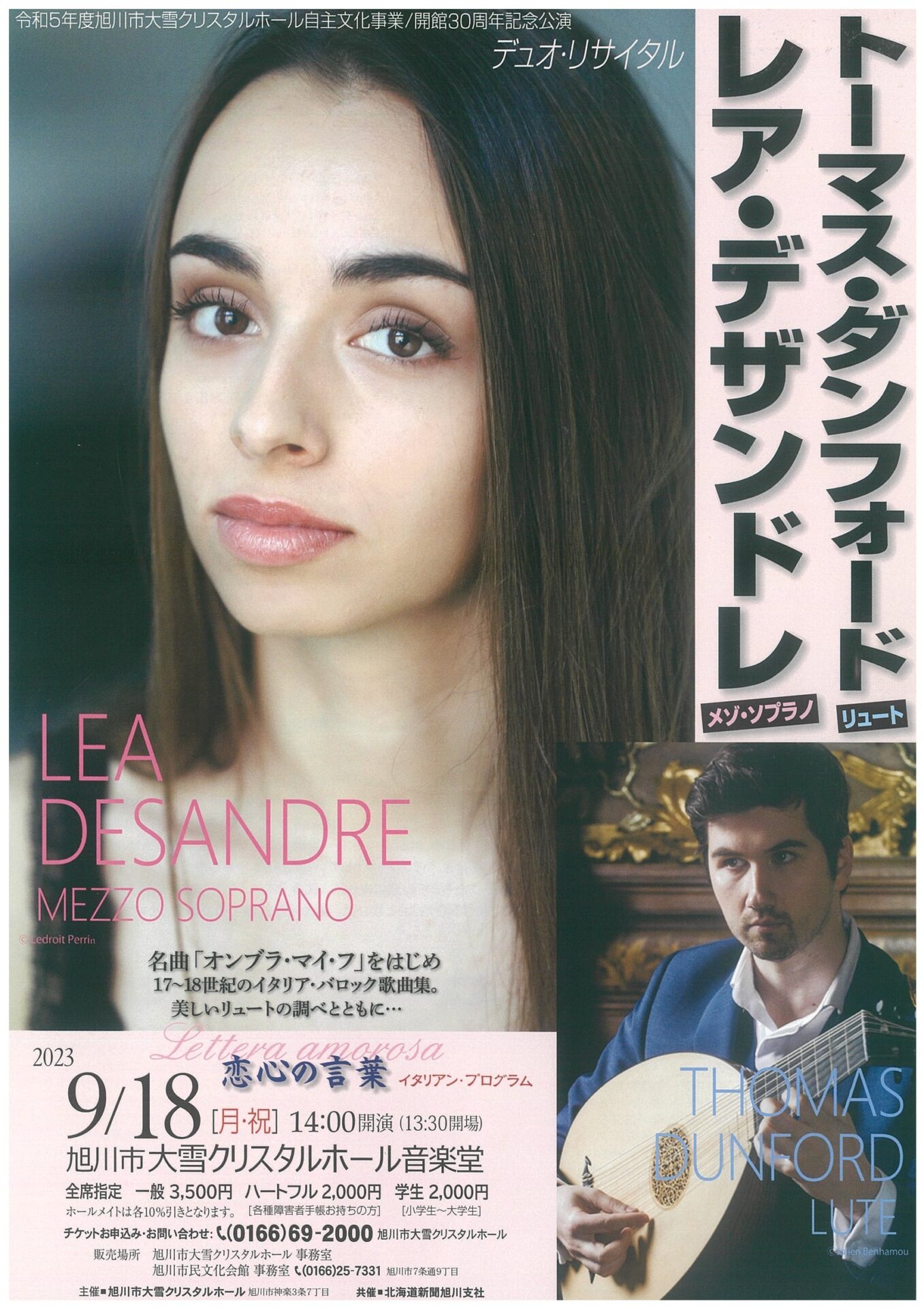 お探しのイベントは終了しましたレア・デザンドレ&トーマス・ダンフォード デュオリサイタル2023年9月18日(月)開場13:30、開演14:00旭川市大雪クリスタルホール 音楽堂(旭川市神楽3条7丁目1-45)音楽