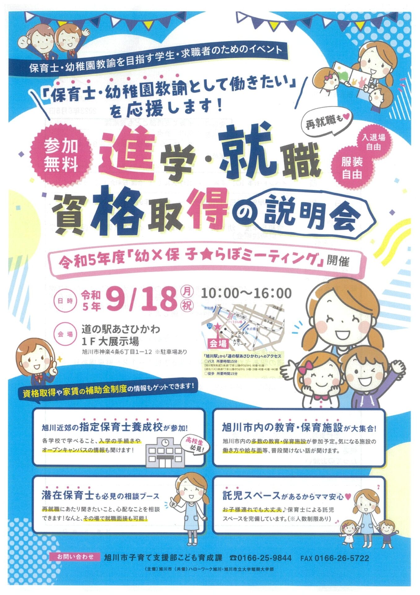 お探しのイベントは終了しました保育士・幼稚園教諭として働きたいを応援します! 進学・就職 資格取得の説明会2023年9月18日(月)10:00~16:00道の駅 あさひかわ 1F 大展示場(旭川市神楽4条6丁目1番12号)
