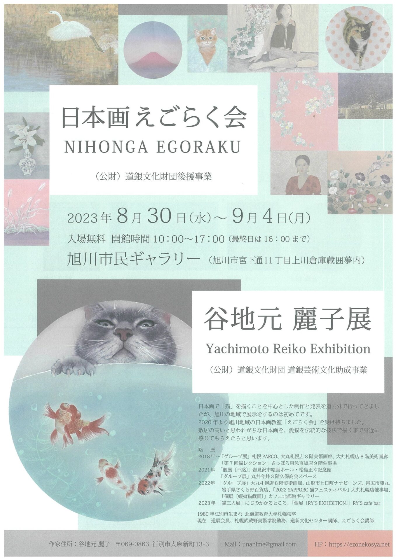 お探しのイベントは終了しました日本画えごらく会展 日本画家 谷地元麗子展2023年8月30日(水) 〜 9月4日(月)10:00~17:00(最終日は16時まで)旭川市民ギャラリー(旭川市宮下通11丁目 上川倉庫 蔵囲夢コレクション館内)芸術文化