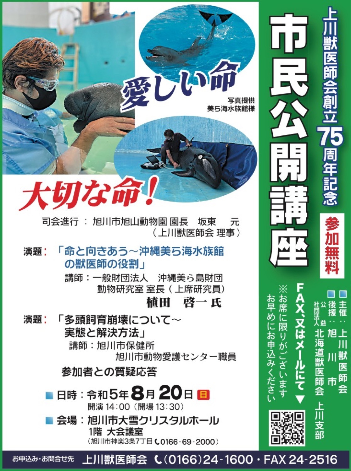 お探しのイベントは終了しました上川獣医師会創立75周年記念 市民公開講座 命と向き合う~沖縄美ら海水族館の獣医師の役割2023年8月20日(日)14:00~16:00旭川市大雪クリスタルホール 大会議室(旭川市神楽3条7丁目1-45)セミナー・講演