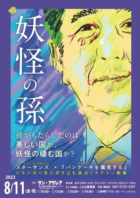お探しのイベントは終了しましたドキュメンタリー映画「妖怪の孫」上映会2023年8月11日(金)①10時〜 ② 13時〜 ③ 16時〜 ④ 19時〜サン・アザレア(旭川建設労働者福祉センター)(旭川市6条通4丁目)封切りから5ヶ月、全国で話題の映画です。旭川でも上映会をいたします。今を考えるために、安倍晋三元総理大臣を好きな方も、嫌いな方も、特に思っていない方も是非ご覧ください。さまざまな関係者に取材して、安倍元総理に迫ります。