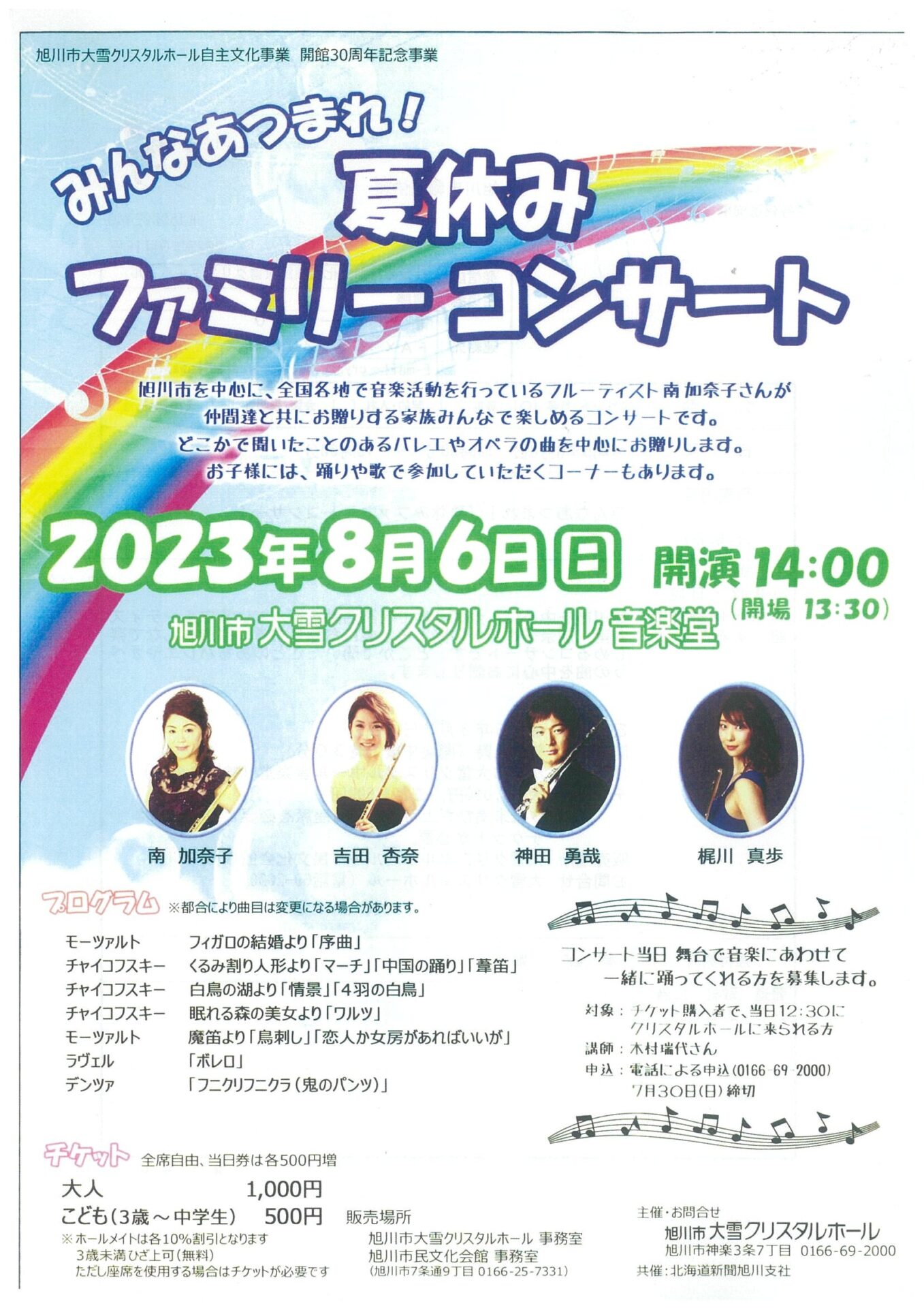 コンサート当日、舞台で音楽にあわせて一緒に踊ってくれる方を募集します。 対象:チケット購入者で、当日12時30分までにクリスタルホールに来られる方 講師:木村 瑞代さん 申込:電話による申込(0166-69-2000)7月30日(日)締切