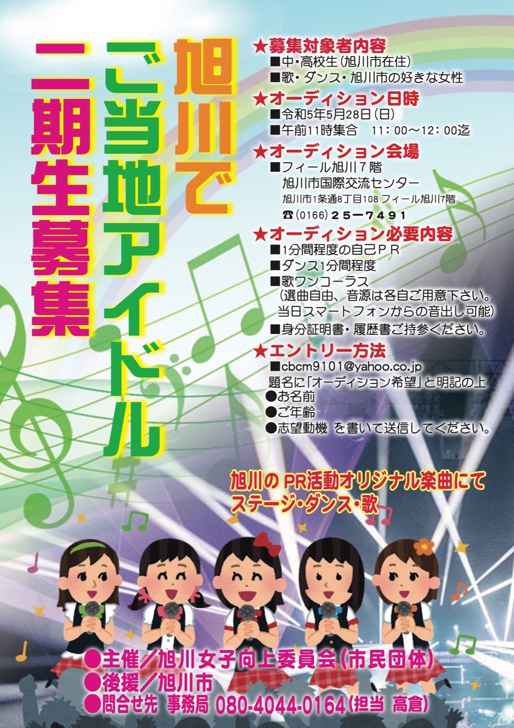 お探しのイベントは終了しました旭川ご当地アイドル2期生オーディション2023年5月28日(日)フィール旭川7階(旭川市1条通8丁目)旭川市のご当地アイドルオーディションを行います ご当地ソングで歌とダンスでまちおこしに協力してくれる中高生の女性を募集致します。 主催/旭川女子向上委員会 後援/旭川市 問合せ事務局/080-4044-0164担当/高倉