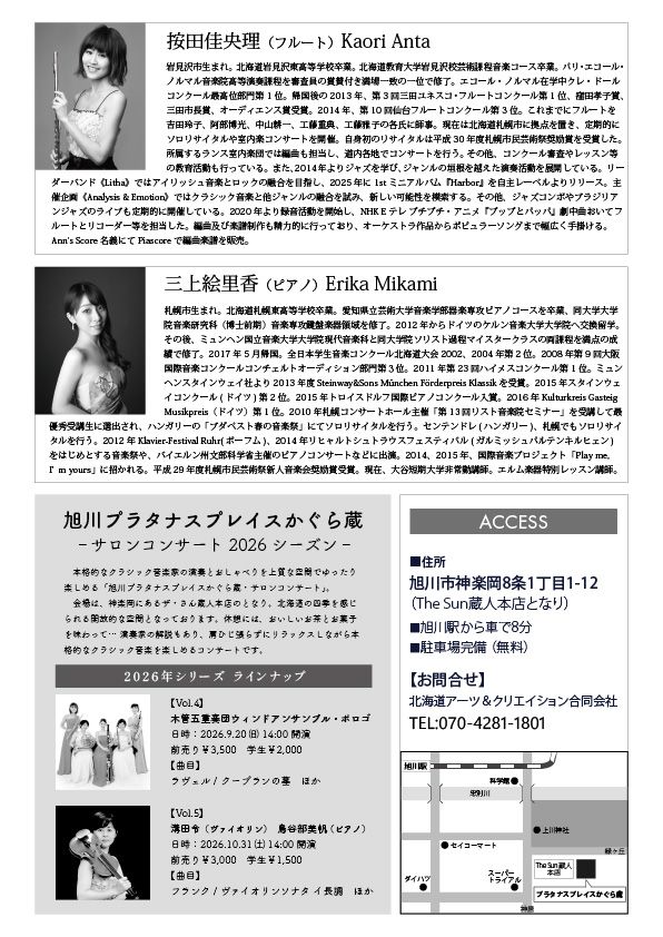 演奏家の解説を聞きながら…休憩には、おいしいお茶とお菓子を楽しみつつ、肩ひじ張らずにリラックスして楽しめるサロンコンサートです。 2026年第一弾はフランスで演奏を学び、札幌を拠点にコンサートから録音まで幅広く活躍中のフルート奏者:按田佳央理。伴奏にはドイツで学び、近年では後進の育成にも定評のある本格派ピアニスト:三上絵里香を迎えてお送りいたします。 今回はフルートの名曲に加えてアルトフルート、とピッコロを使った非常に聴きごたえのあるプログラムとなっております。