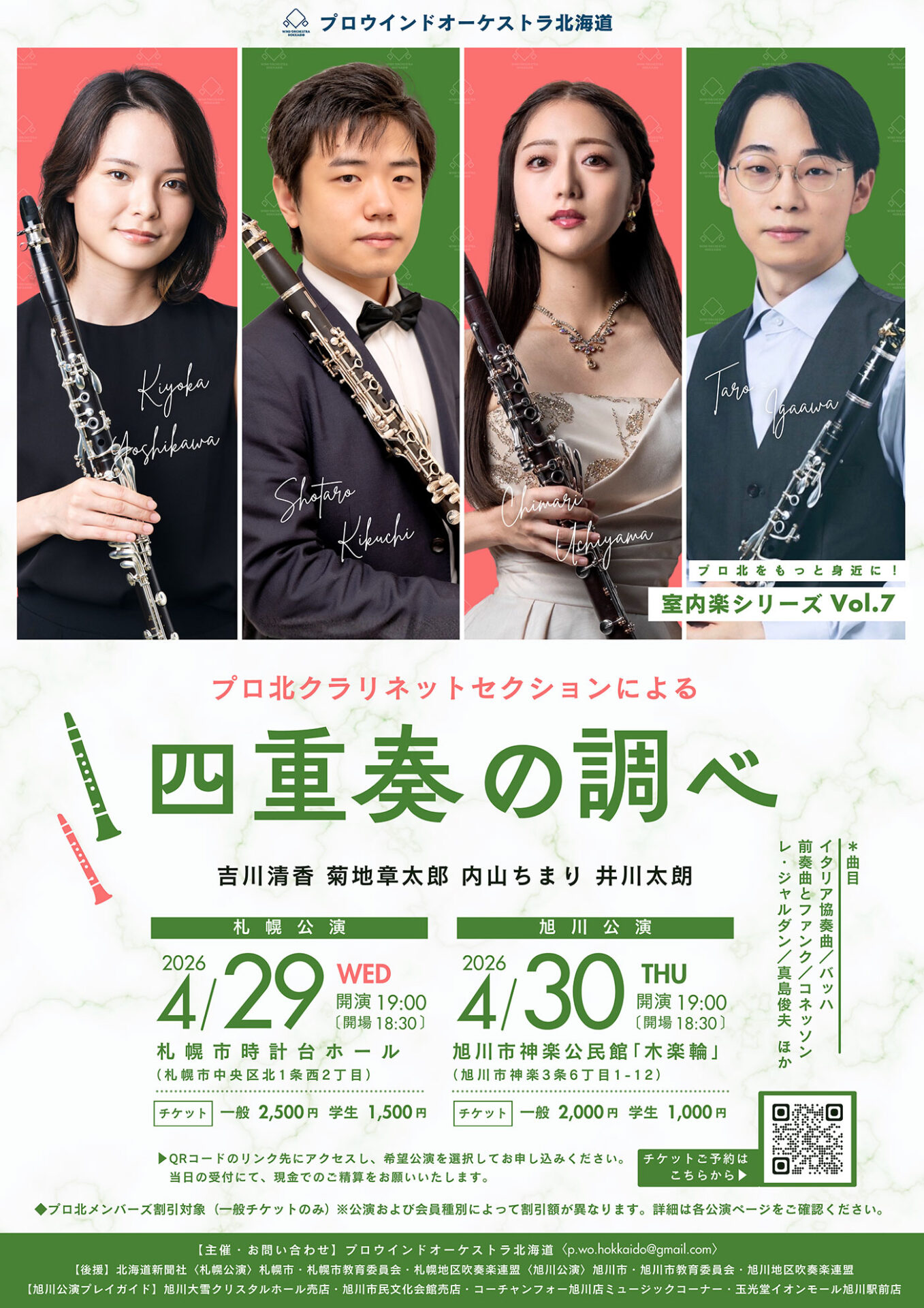 プロウインドオーケストラ北海道がお届けする、室内楽コンサートVol.7! 【札幌公演・旭川公演】\2公演開催決定!/ クラリネットならではの本格的なプログラムと、4人が織りなす多彩な音色をぜひ会場でお楽しみください! ■旭川公演 日程:2026年4月30日(木) 開演:19:00 開場:18:30 会場:旭川市神楽公民館「木楽輪」 住所:旭川市神楽3条6丁目1-12 ■チケット申込方法 https://prokitawind.com/chamber-vol-7 ■出演 吉川清香(旭川市出身) 菊地章太郎(七飯町出身) 内山ちまり(苫小牧市出身) 井川太朗(小樽市出身) ■曲目 バッハ:イタリア協奏曲 コネッソン:前奏曲とファンク 真島俊夫:レ・ジャルダン 他