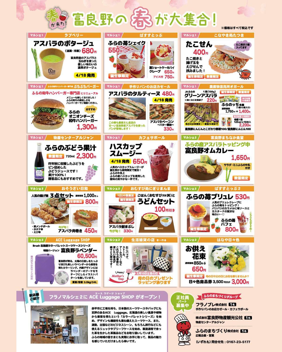 ★★★フラノマルシェ誕生祭のお知らせ★★★ 日頃の感謝を込めて、今年も誕生祭を開催します! 2日間限定メニューやお得な商品、楽しい企画をご用意して、皆さまをお迎えします。 毎年オープン前から行列のできる農産物直売所オガールのアスパラの特売を始めとした、誕生祭と言えば!のお得な商品や、誕生祭を皮切りに今シーズン初登場のアスパラグルメもいろいろ! 初登場の商品▶ ★こなやき処たつき「たこせん」 ★ばすすとっぷ「ふらの苺シェイク」 ★おそうざい日和の3点セットは内容がリニューアル! フラノマルシェイメージキャラクターのトマ☆Pも久々の登場! お子様へ、風船プレゼントと写真撮影会を行います。 ご来場をお待ちしております!