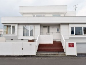 - 真っ白な外観の住宅。駐車スペースもあるので車でどうぞ