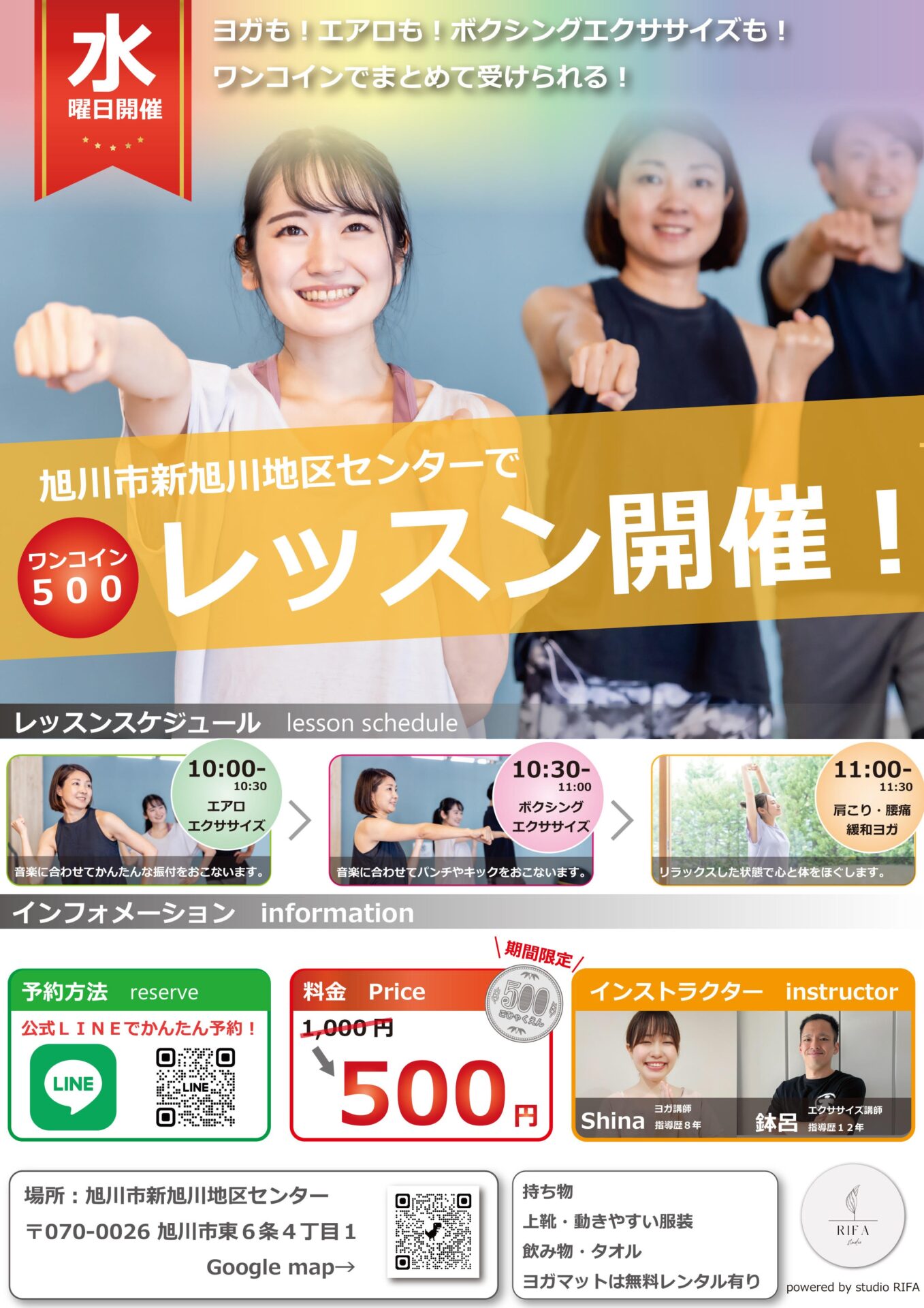 エクササイズもヨガもまとめて楽しめる90分のレッスン♪ 初めての方でも安心♪かんたんな振り付けのエクササイズと、 ゆったりと自分のペースで出来るヨガをおこないます! 休みながら出来るので体力に不安がある方でも安心です☆ 【スケジュール】 10:00~10:30 エアロエクササイズ 音楽に合わせてかんたんな振り付けを楽しむ30分間のエクササイズです 10:30~11:00 ボクシングエクササイズ 音楽に合わせてパンチやキックなどの動きをおこないます、 ストレス発散にもおすすめ! 11:00~11:30 肩こり腰痛緩和ヨガ リラックスしたゆったりとした動きでヨガをおこない、 心身共にほぐします。 肩こりや腰痛の緩和が期待出来ます。