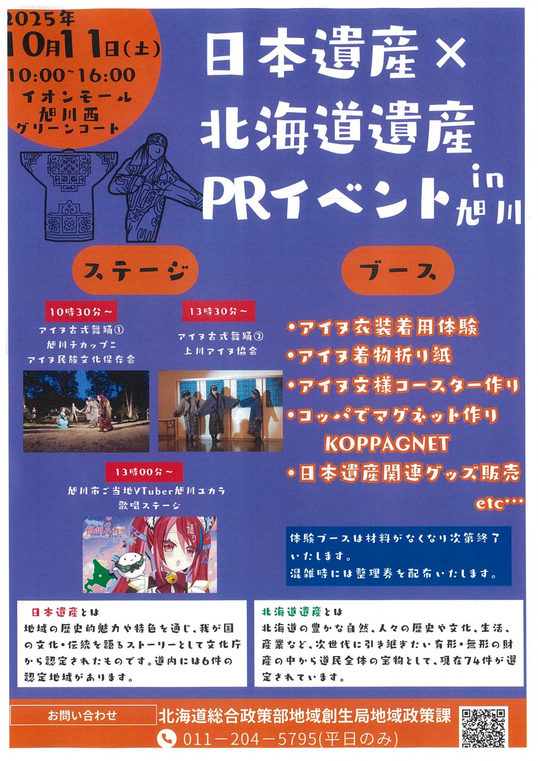 大雪山麓上川アイヌ日本遺産をはじめ、日本遺産と北海道遺産の魅力をステージイベントと体験ブース(材料がなくなり次第終了)で紹介します。
