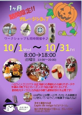 他にもフエルトで作るハロウィンお化けや松ぼっくりのオーナメント等が作成できます。ハンドメイド作品も販売中です。10/31迄の期間限定ショップなのでお見逃しなく!