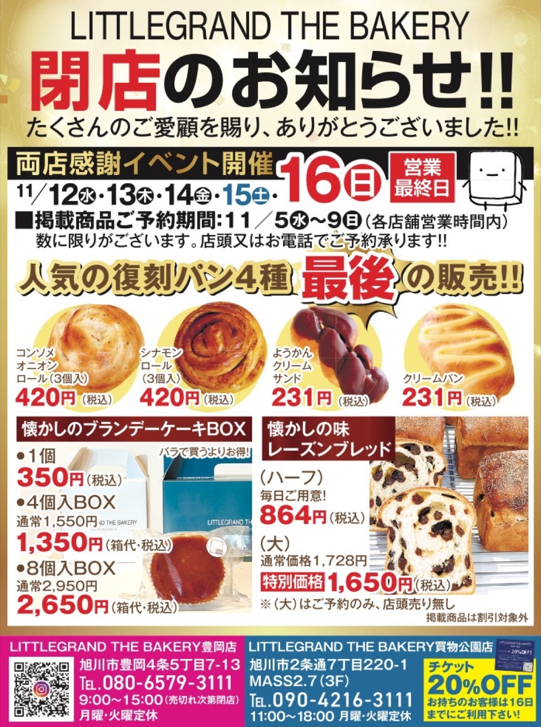 | 住所 | LITTLEGRAND THE BAKERY豊岡店(旭川市豊岡4条5丁目7-1)LITTLEGRAND THE BAKERY買物公園店(旭川市2条通7丁目220-1MASS2.7(3F)) |