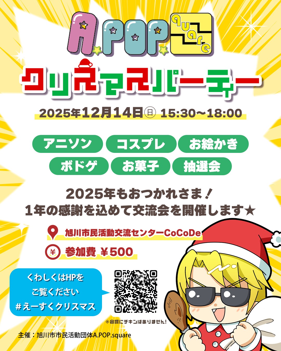 旭川のサブカルイベント運営団体「えーすく」から、1年間の感謝を込めて交流会を開催します!アニソンが流れる会場でコスプレ撮影、お絵描き、ボドゲを楽しめる空間です。お楽しみ抽選会もあります!