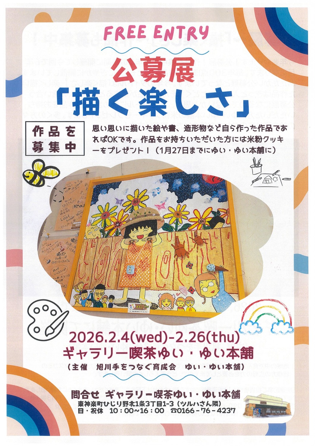 思い思いに描いた絵や書、造形物など、自ら作った作品の公募展。作品は1月26日まで募集しています。作品をお持ちいただいた方に「ゆい・ゆい本舗の米粉クッキー」をプレゼントします。