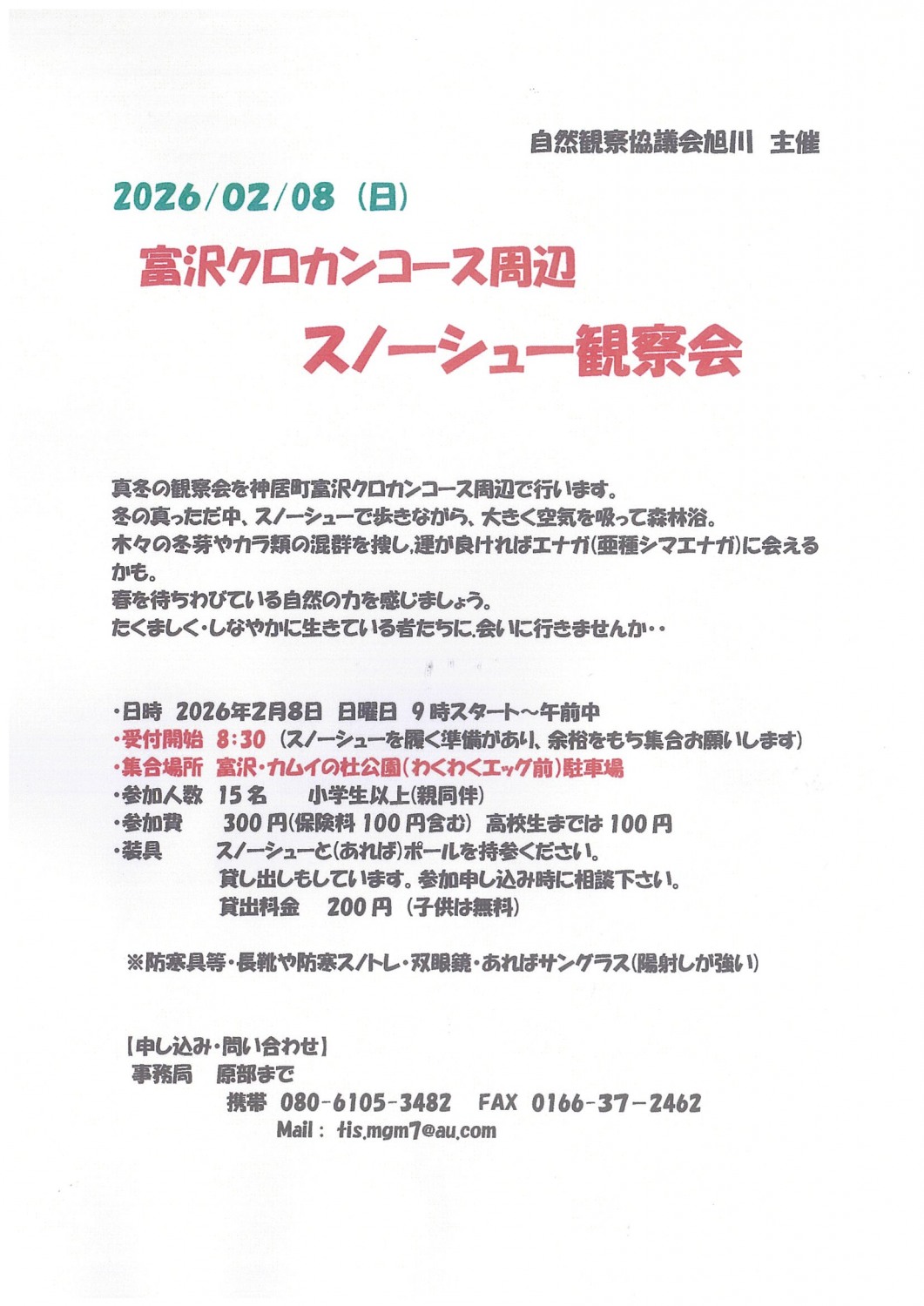 | 料金・費用 | 参加費:300円(高校生までは100円) スノーシュー貸出料金:200円(子供は無料) |