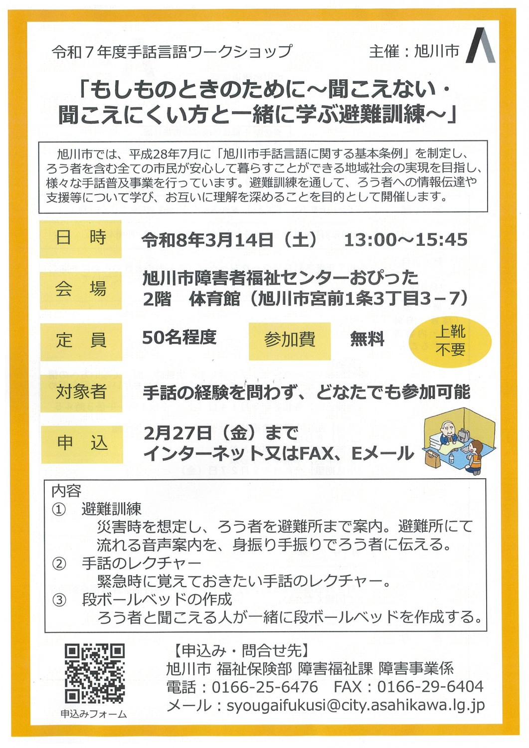 | 備考 | 定員:50名程度 申込:2月27日(金)までインターネット又はFAX(0166-29-6404)、Eメール(syougaifukusi@city.asahikawa.lg.jp)からお申し込みください |